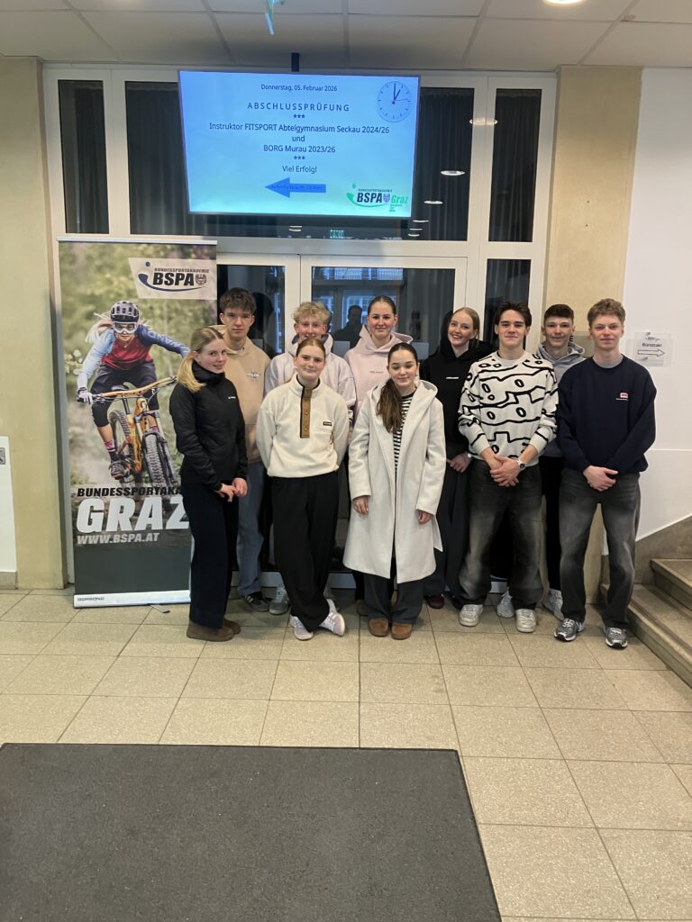 An der BSPA Graz legten zehn Schüler*innen erfolgreich die Abschlussprüfung zur Instruktorin bzw. zum Instruktor für Fitsport ab. Geprüft wurden die zentralen Ausbildungsbereiche Sportbiologie, Bewegungslehre & Biomechanik, Trainingslehre sowie praktisch‑methodische Übungen mit Lehrauftritt und Kompetenzgespräch.